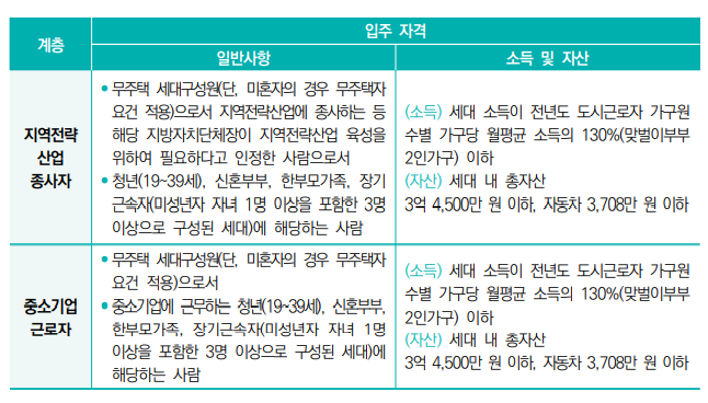 생계급여·의료급여 수급자, 일본군위안부 피해자, 한부모가족, 도시근로자 월평균소득 70%(3인 기준 503만 9,054원, 1인 가구 90%, 2인 가구 80%) 이하의 국가유공자, 북한이탈주민 및 장애인 등 무주택 세대구성원.