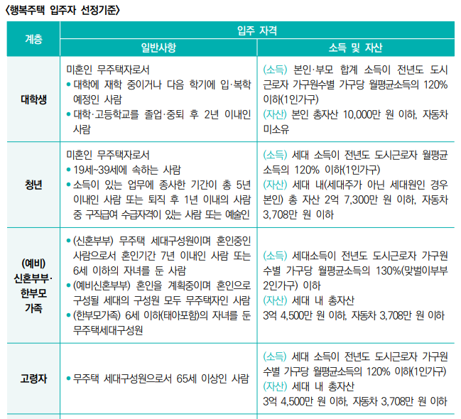 • 총자산 : 2억 4,100만 원 이하, 자동차 3,708만 원 이하. ※ 수급자, 위안부피해자, 한부모가족 등은 자산요건 미적용.