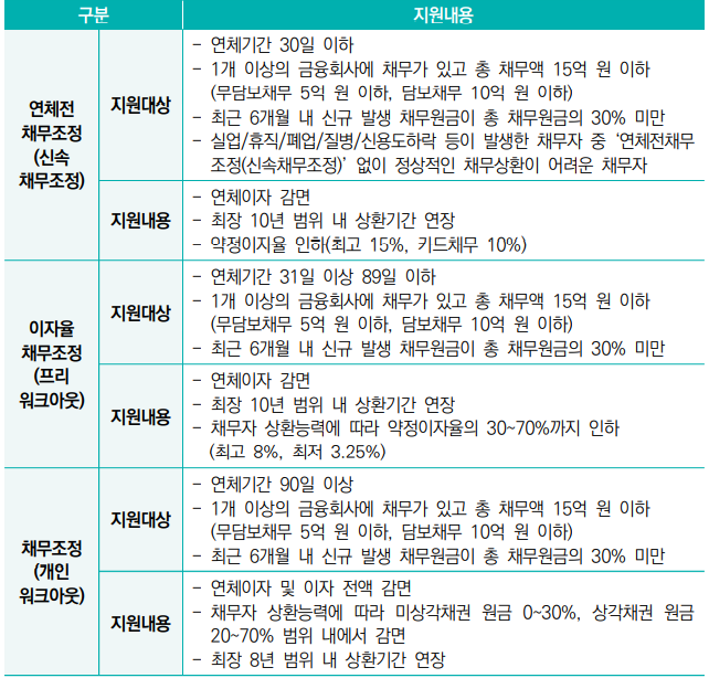 채무자의 상황(연령, 연체기간, 소득 등)에 따라 상환기간 조정(최장 10년), 이자율 조정, 이자 감면, 원금 감면 등을 지원