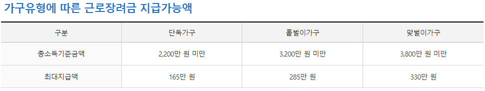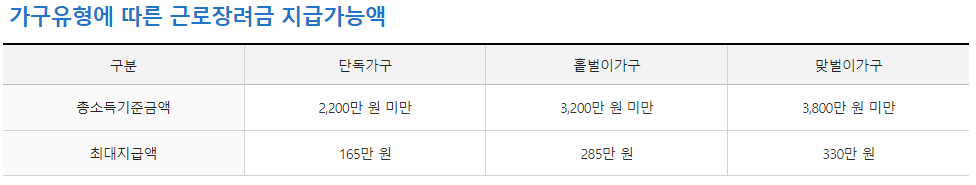 일은 하지만 소득이 적어 생활이 어려운 근로자, 사업자(전문직 제외)가구에 대하여 가구원 구성과 근로소득, 사업소득 또는 종교인소득에 따라 산정된 근로장려금을 지급함으로써 근로를 장려하고 실질소득을 지원하는 근로연계형 소득지원 제도입니다. 근로장려금은 가구원 구성에 따라 정한 부부합산 총급여액 등을 기준으로 지급액을 산정합니다.
