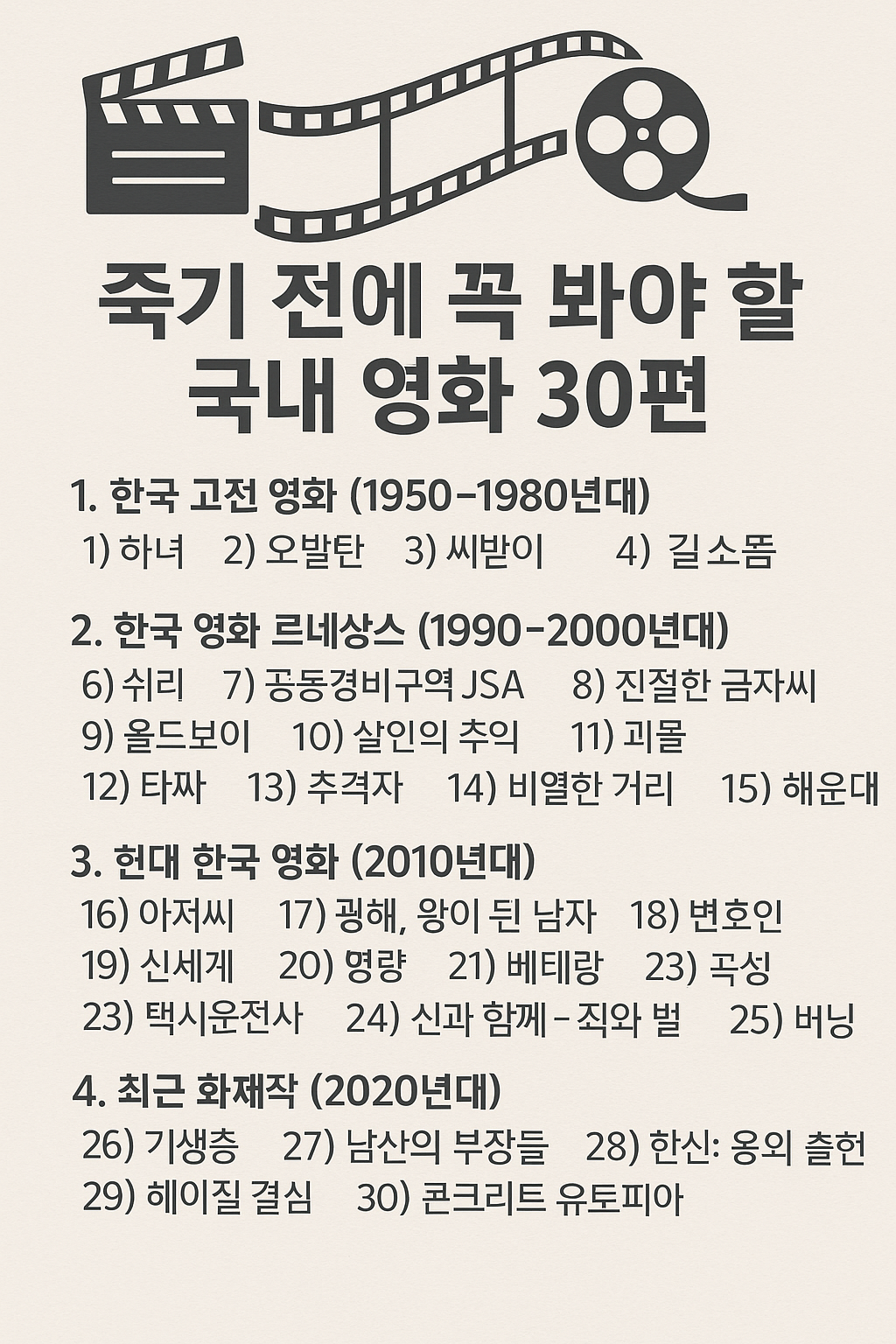 이번 글에서는 한국 영화사의 흐름을 대표하는 국내 영화 30편을 엄선했습니다.