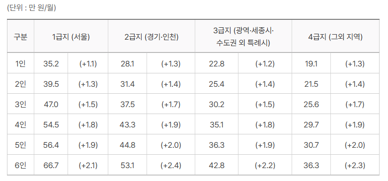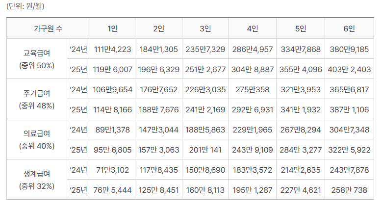 - 4인 가구 기준으로 급여별 선정기준은 생계급여 195만 1,287원, 의료급여 243만 9,109원, 주거급여 292만 6,931원, 교육급여 304만 8,887원 이하이며, 가구원 수에 따른 급여별 선정기준은 아래 표와 같다.