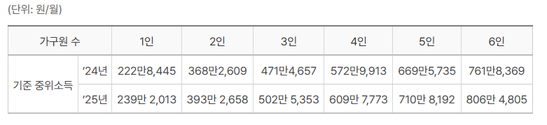 2025년도 기준 중위소득은 맞춤형 급여체계로 전환된 2015년 이후 역대 최고 증가율로 결정하였다. 4인 가구 기준으로 올해 572만 9,913원 대비 6.42% 인상된 609만 7,773원, 생계·의료·주거·교육급여를 포함한 전체 수급가구의 약 74%를 차지하는 1인 가구 기준으로는 올해 222만 8,445원 대비 7.34% 인상된 239만 2,013원으로 결정하였다.