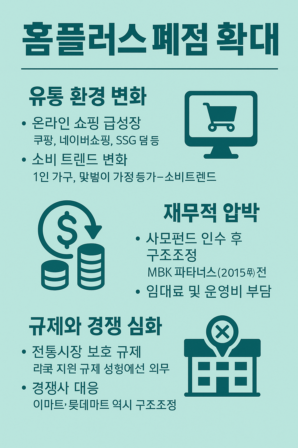 | 폐점 이유 | 온라인 쇼핑 급성장, 소비 트렌드 변화, 사모펀드 구조조정, 임대료 부담, 규제 심화 |