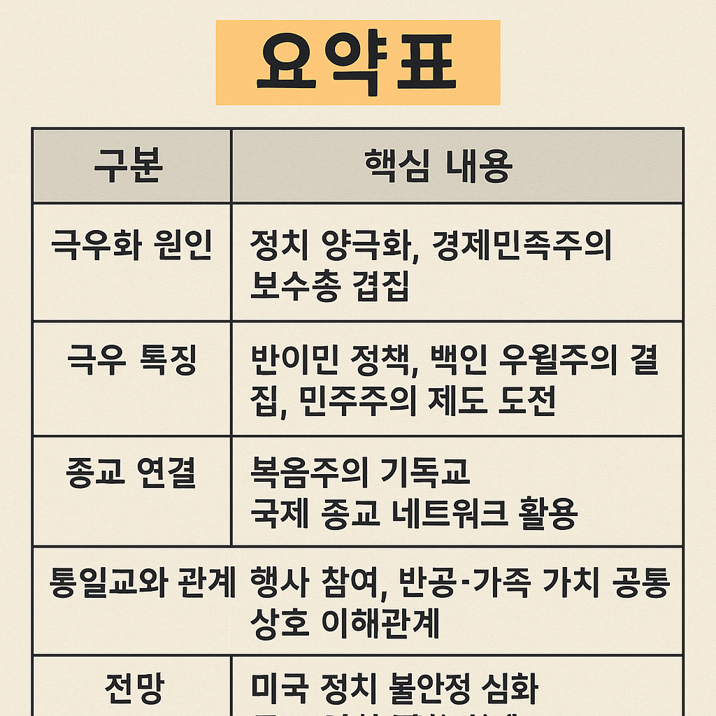 | 전망 | 미국 정치 불안정 심화, 종교-정치 결합 확대, 한미 보수 네트워크 강화 |