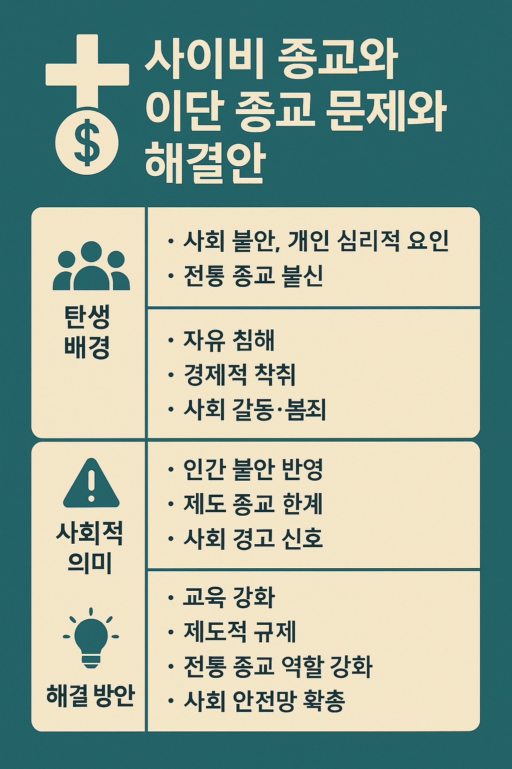 | 해결 방안 | 교육 강화, 제도적 규제, 정통 종교 역할 강화, 사회 안전망 확충 |