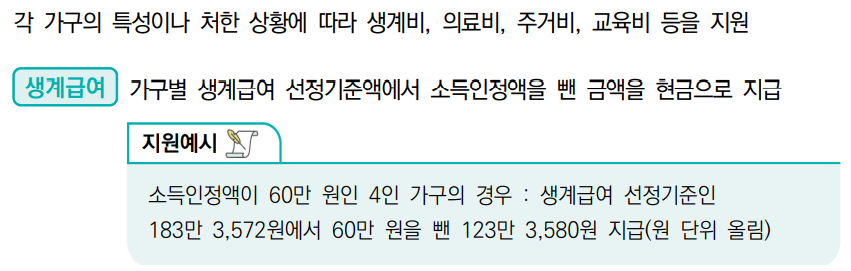 가구별 생계급여 선정기준액에서 소득인정액을 뺀 금액을 현금으로 지급하는 제도입니다.