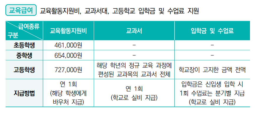 교육활동지원비, 교과서대, 고등학교 입학금 및 수업료를 지원하는 제도입니다.